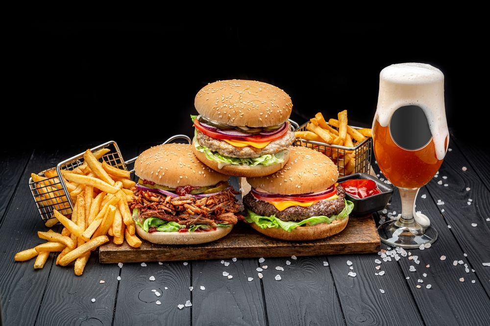 Chifla, carne de vita-porc, Cheddar, bacon, salata verde, castraveti murati, ceapa, rosii, sos Bbq, sos samurai, cartofi prajiti - 490g