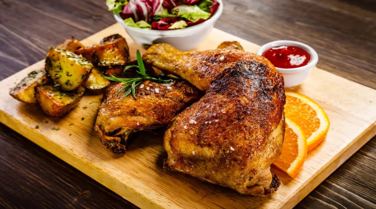 Carne de pui rotisata, cartofi prajiti, mix de salate, mix de sosuri, chifla la vatra - 850g