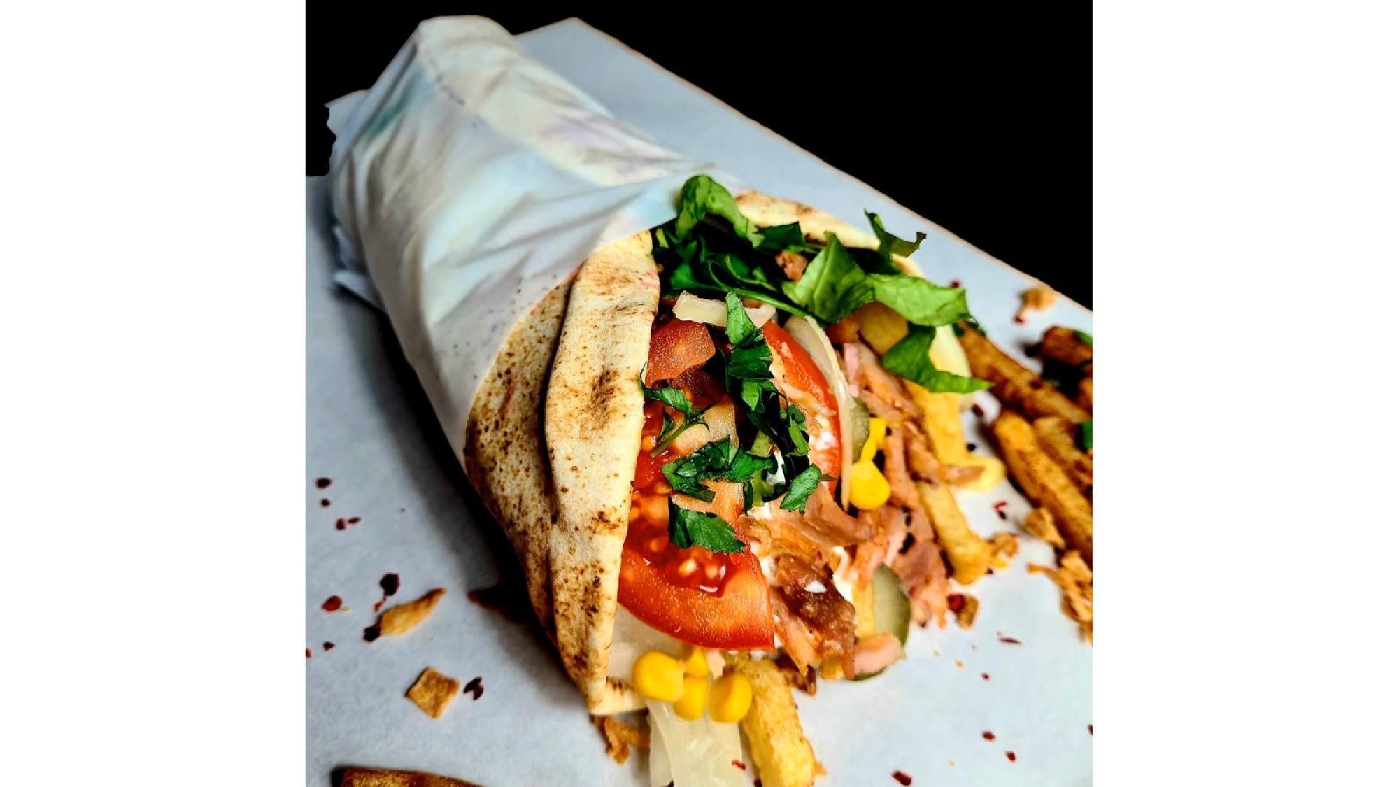 Carne de vită/berbecut, pui sau porc, cartofi prăjiți, salată de varză, castraveți murați, roșii, ceapă, pătrunjel, sosuri (mediteranean, Doner, antep, sambal, ketchup, maioneză), ardei iute, lipie mică - 250 - 500g