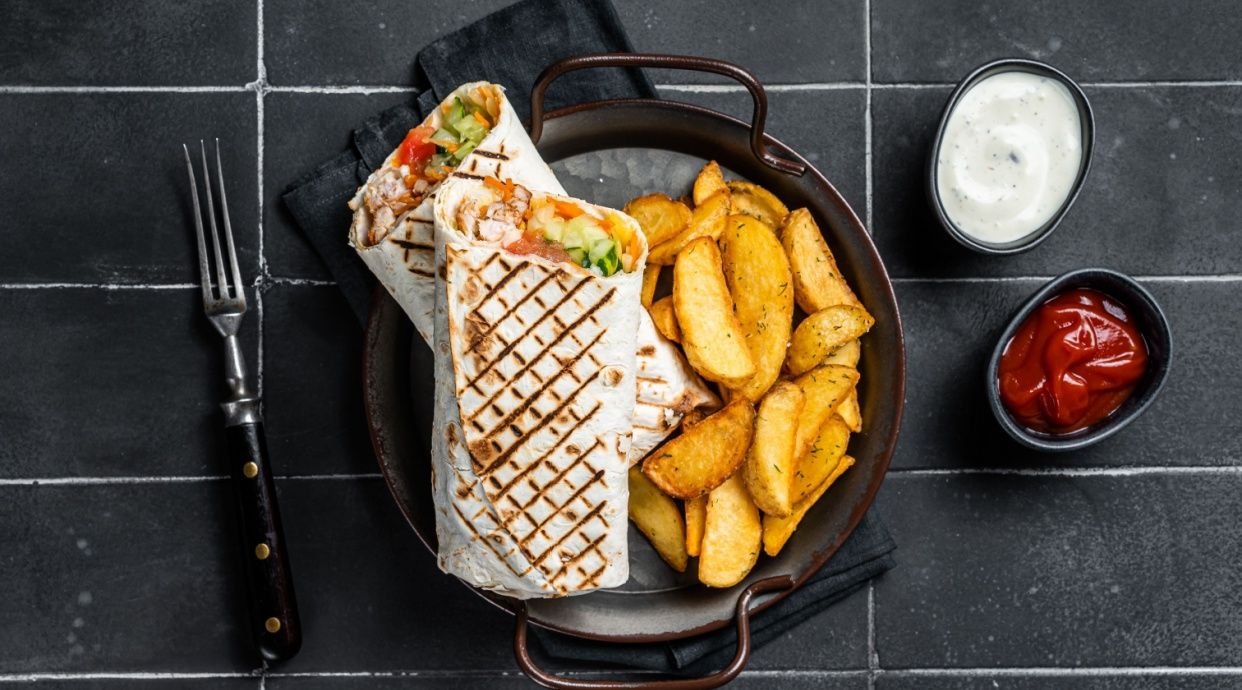 Carne de vită, carne de pui, cartofi prăjiți, salată (varză, roșii, castraveți), sosuri (usturoi, maioneză, ketchup) - 400g