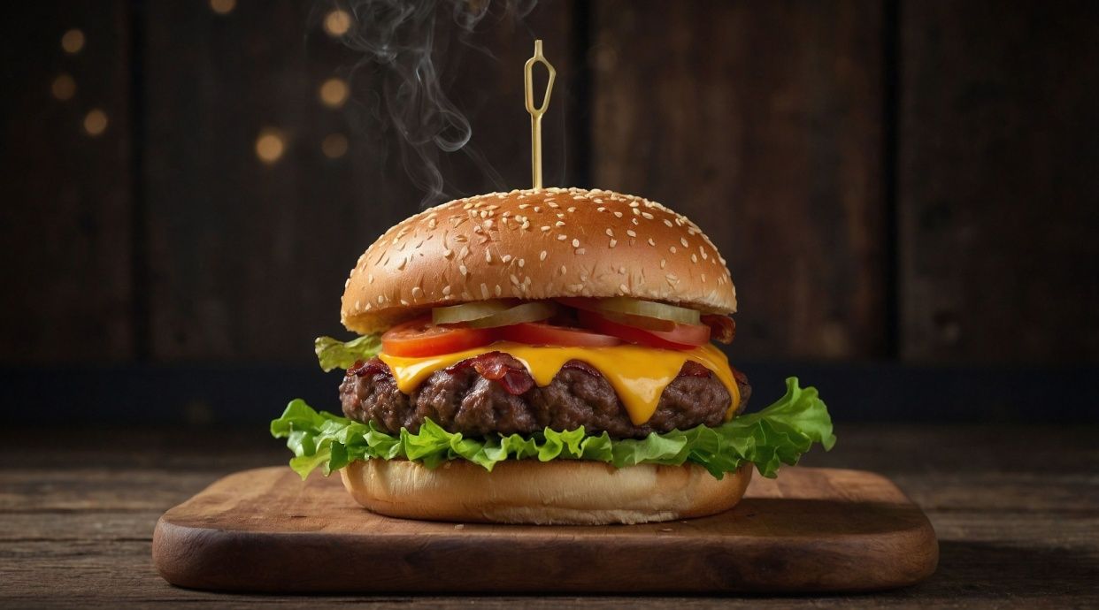 Chifla artizanala, 2 paline carne vita, bacon crispy, rosie fresh, salata iceberg, sos rosii uscate preparat, sos taratar preparat, cedar, ceapa rosie fresh, sosul casei, cartofi prajiti - 450g