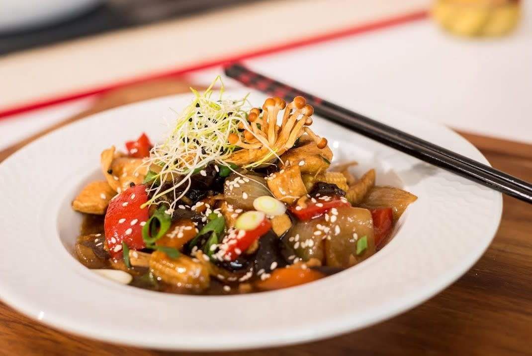 Piept pui, ciuperci, kapia, ceapa, sos de soia,rosii cherry, chilli - 300g