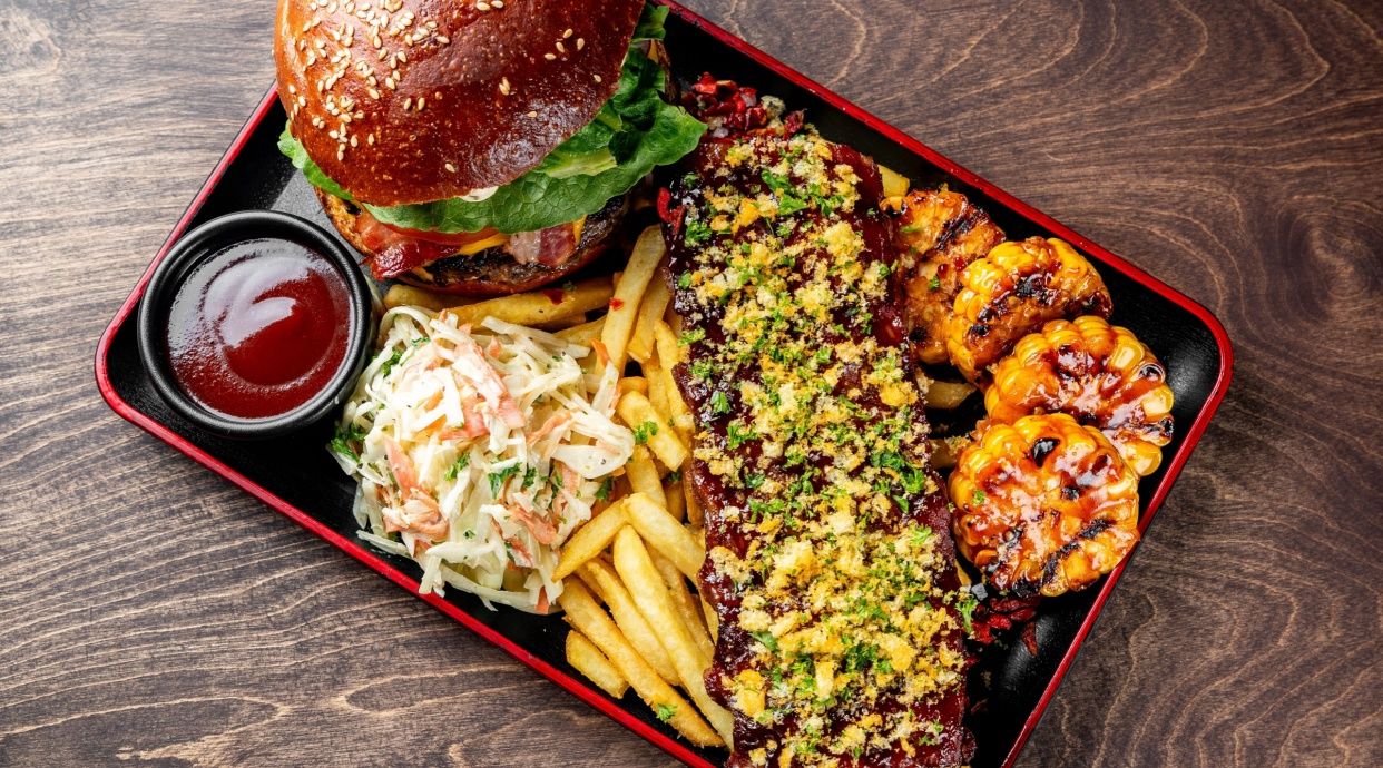 Coaste de porc, pulpa de pui, aripi de pui, pulled pork, ciolan de porc, iahnie de fasole afumata, mac'n cheese, cartofi dulci prajiti si sos bbq cu prune