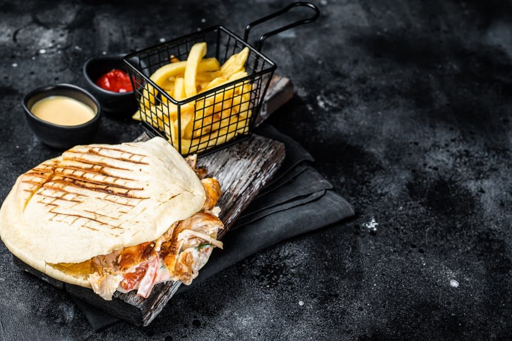 Lipie, carne, cartofi prajiti, salata (ceapa, varza, rosii, castraveti murati, castraveti verzi, salata verde), sosuri (ketchup, maioneza, sos usturoi, sos picant) - 450g