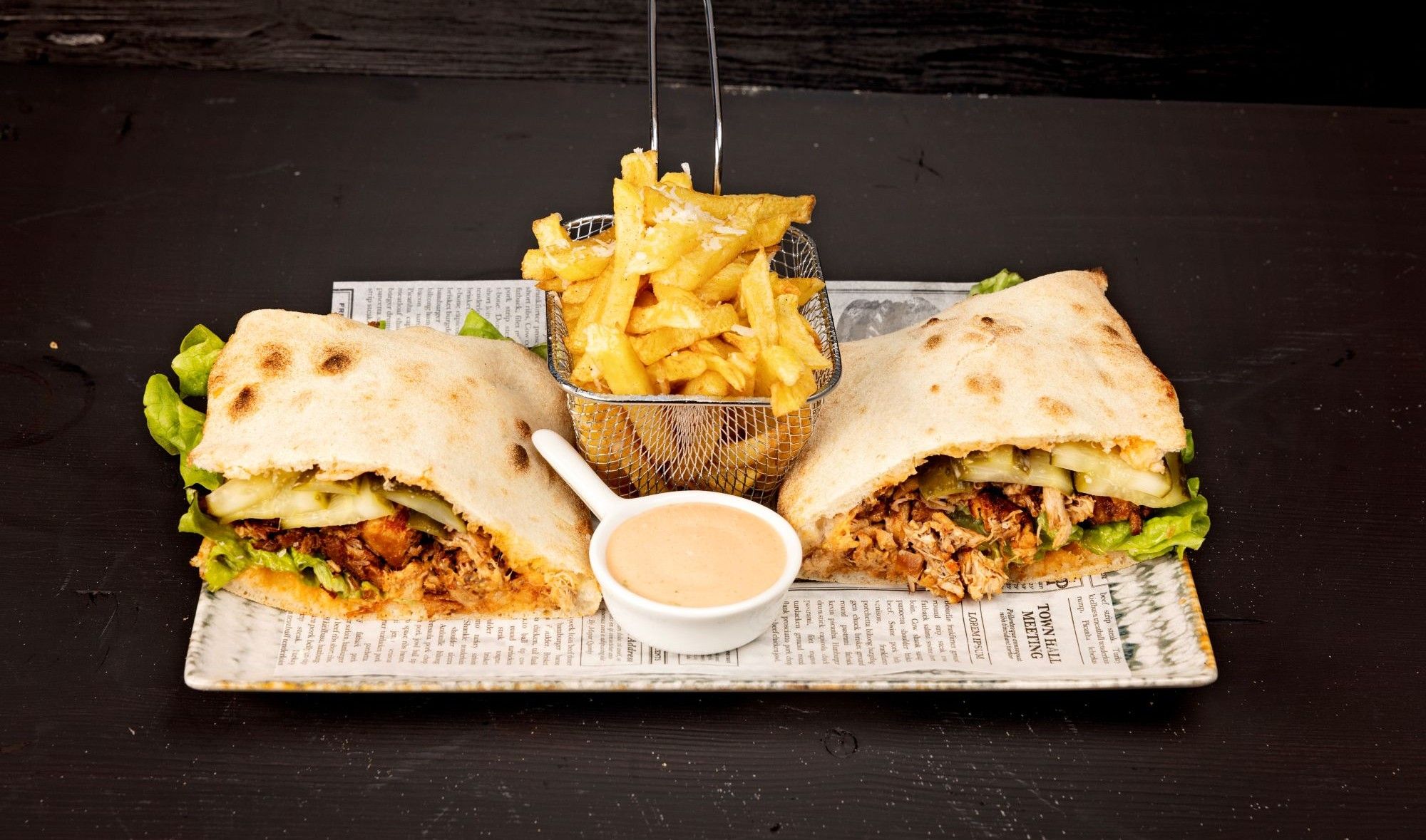 Focaccia, carne de porc, sos „Le Dôme", salată, castraveţi murați, cartofi prăjiți - 650g