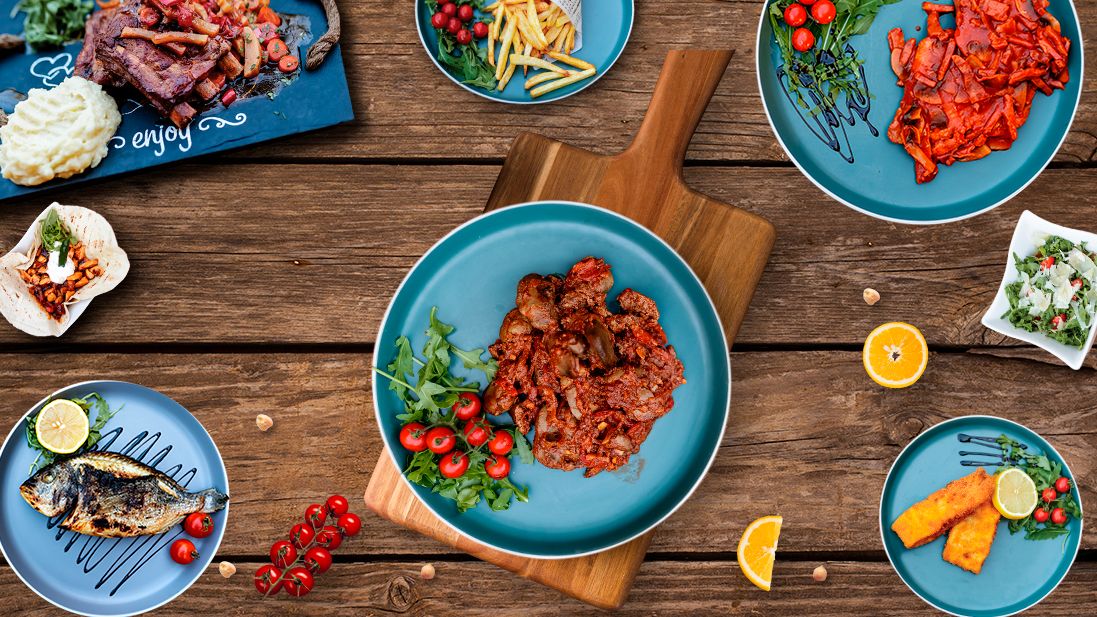 Mici, ceafa de porc, cotlet de porc, cordon bleu, salata de varza alba, salata de ardei copti, cartofi aurii, ciuperci sote, aripioare de pui, piept de pui, cascaval pane, paine - 1.2kg