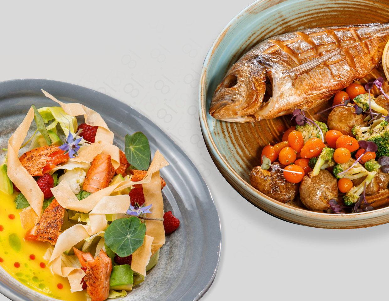 внутрішня свинна вирізка картопля вершково-грибний соус, салат мікс, томат чері, огірок, медово-гірчичний соус.