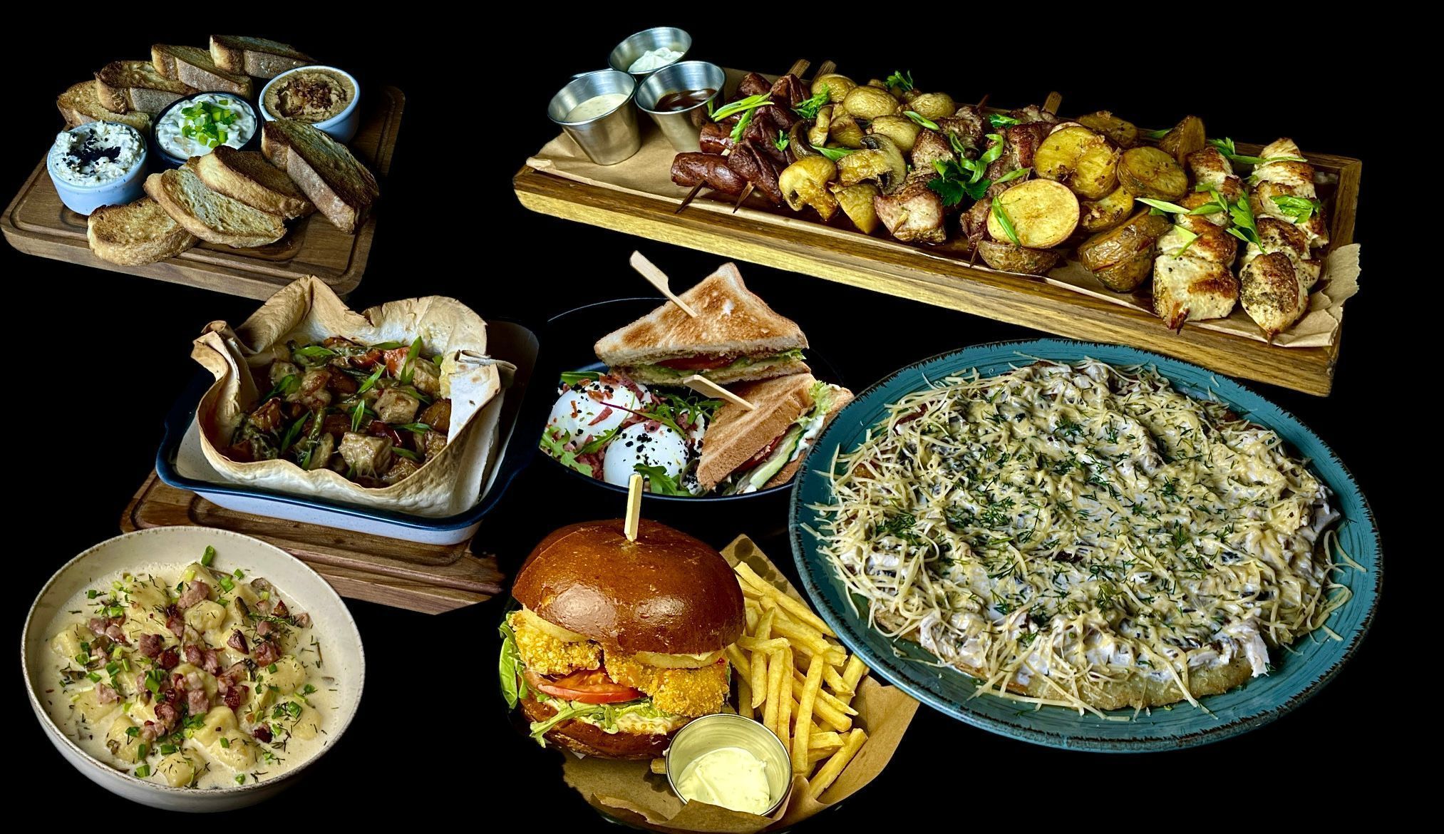 Шашлик курячий, шашлик свинний, ковбаски Ранчо, картопля в мундирах, крокет, кукурудза. Подається з часниковим та копченим BBQ соусами