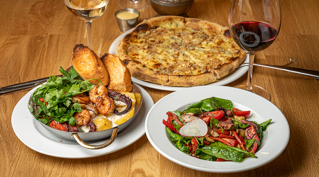 вершково винний соус, восминіг, кальмар, креветки, томати чері та зелень
