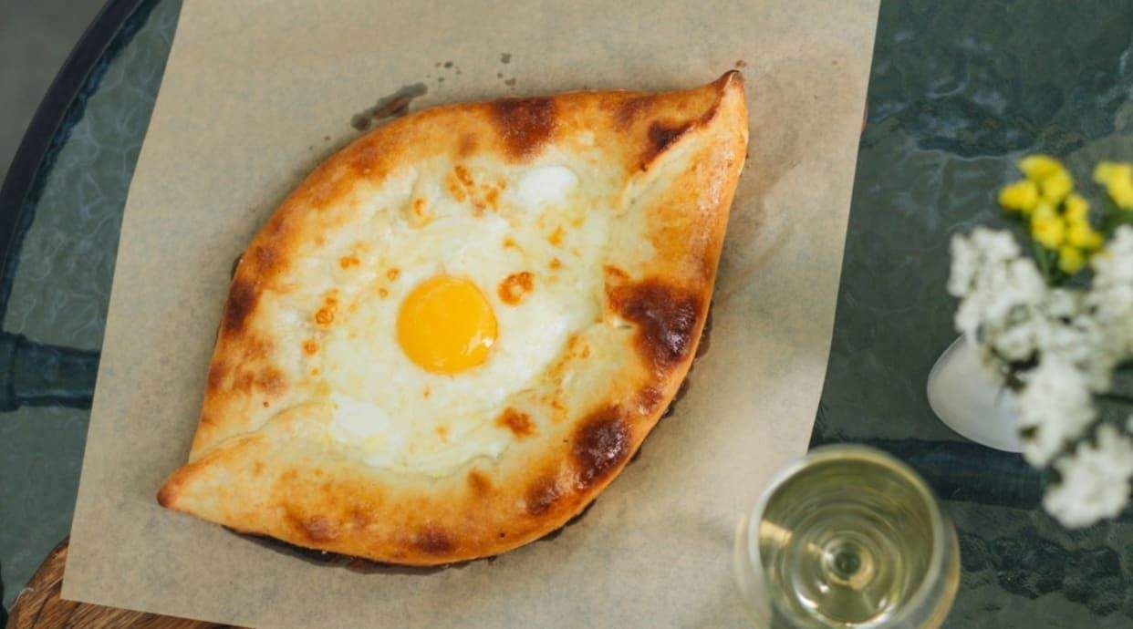 Тісто, сири: Сулугуні та Бринза, білок, жовток, вершкове масло. Хачапурі у формі човника з сирим жовтком всередині