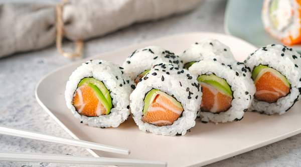 Рол покритий слайсами охолодженого лосося. Усередині - начинка з вершкового сиру, та авокадо, загорнута в м"який рис і хрустке норі. Подається з класичними доповненнями: соєвий соус (50г), маринований імбир (15г) та гострий васабі (10г).