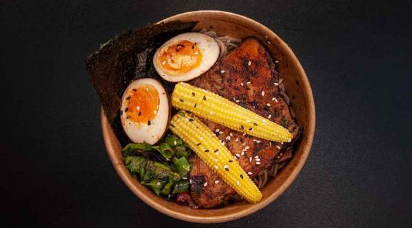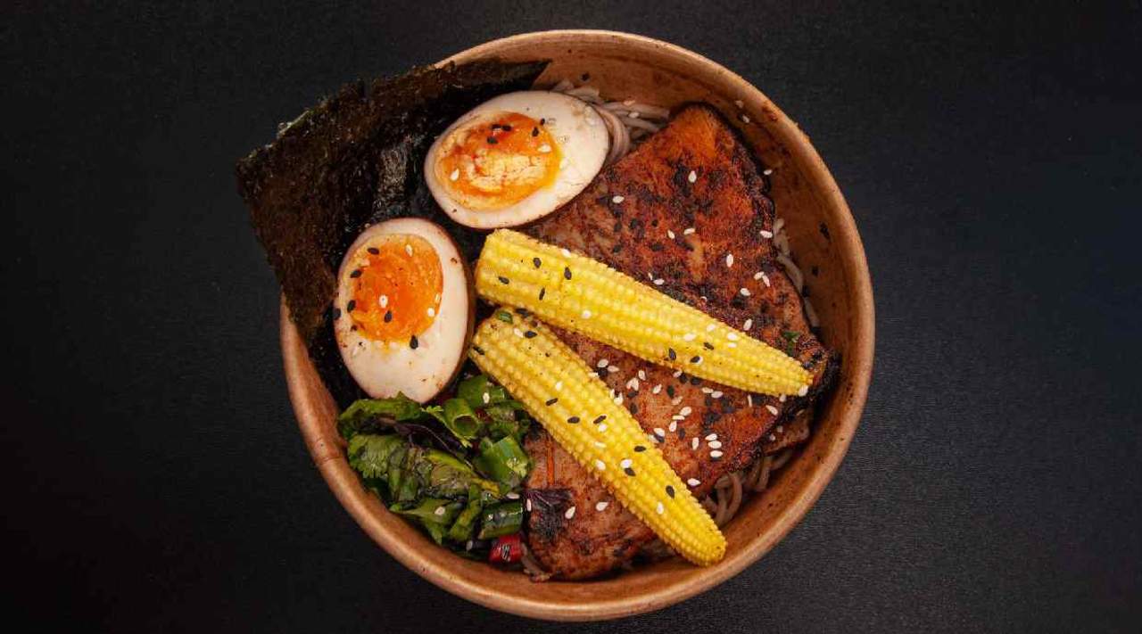 Бульйон, локшина рамен, індичка, бульйон, кукурудза, яйце мариноване, норі, зелений мікс, кунжут