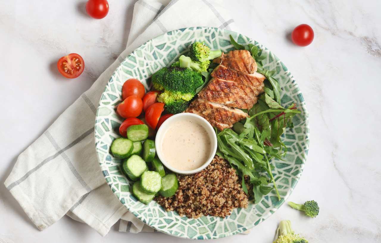 քինուա, բրոկոլի, մոցարելա, չերի լոլիկ (կկալ 291, սպ. 9, ճարպ 7, ածխջ. 3)