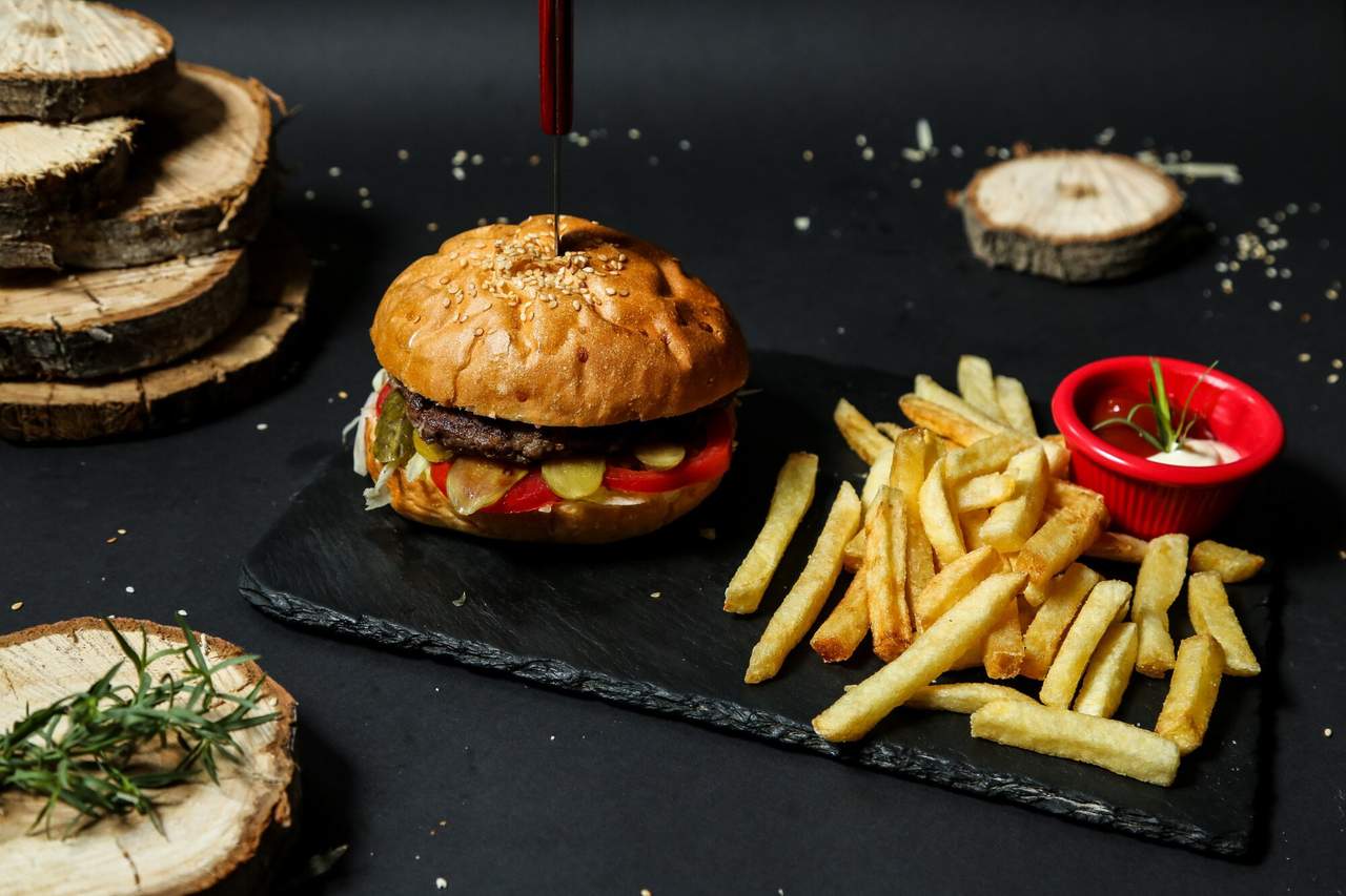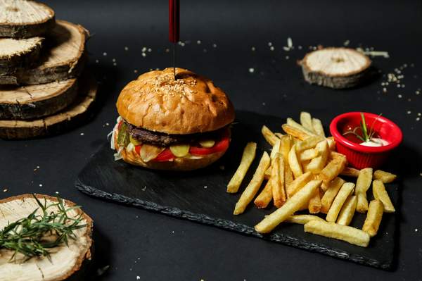 Juneće meso, salata, paradajz, kiseli krastavac, luk, sos, pecivo, pekarski krompir