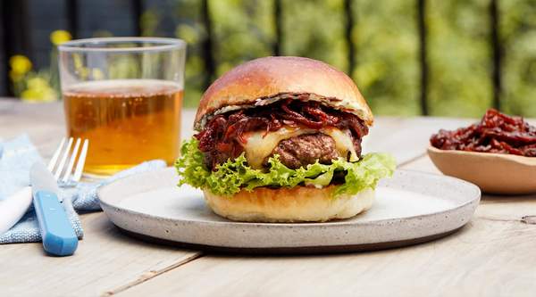 Телешка плескавица с кашкавал, пресни пържени картофи, свежи зеленчуци и сосове. / 470 гр.