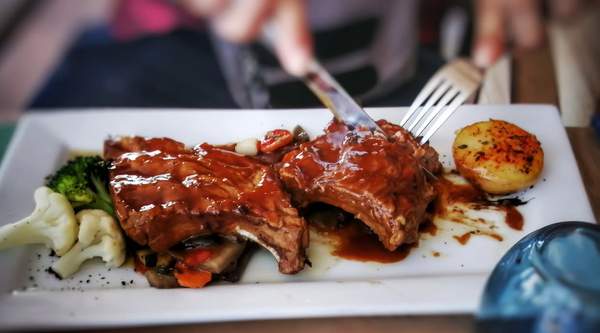 Свински ребра, пресни пържени картофи, сос бпрбекю
