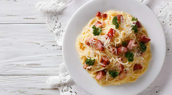 Двуцветни талиолини с бекон, гъби, сметана, синьо сирене, топено сирене, пармезан