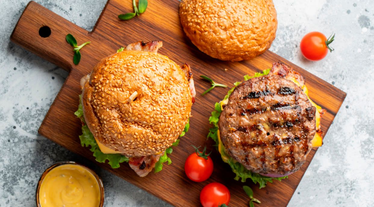 Телешко меско, чедър, яйце, паниран лук, рукола, свежа салата, домат, майонеза, картофки