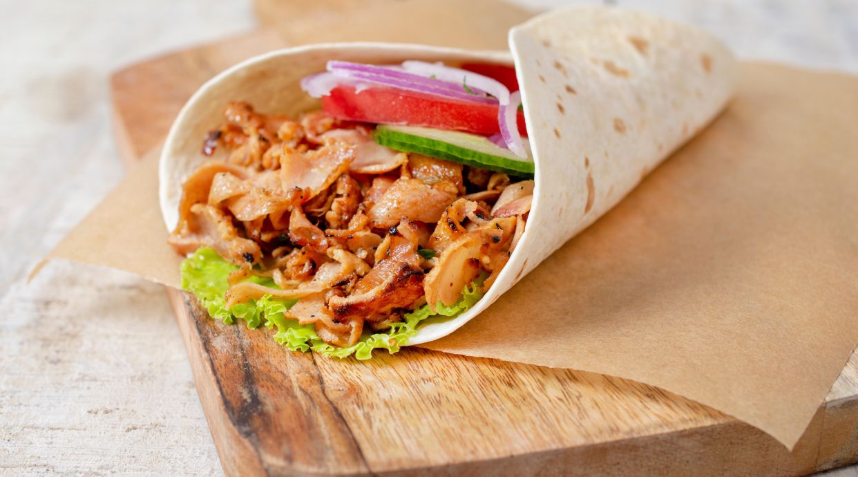Питка лаваш, Пилешко месо, картофи, домати, кисели краставички и чеснов сос - 550г