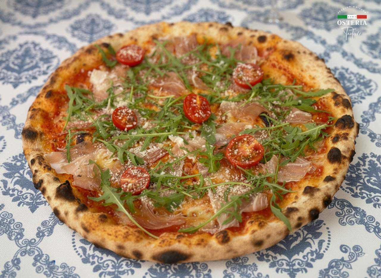 Доматен сос, моцарела Фиор ди Лате, прошуто Сан Даниеле, чери домати, рукола, Пармиджано Реджано зряло 24 месеца, зехтин - 670г