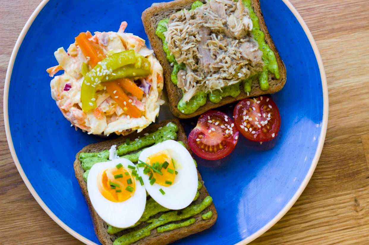 пълнозърнест хляб , мус от авокадо, филе сьомга, мариновани зеленчуци, див лук / / whole grain bread, avocado mousse, salmon fillet, pickled vegetables, wild chives