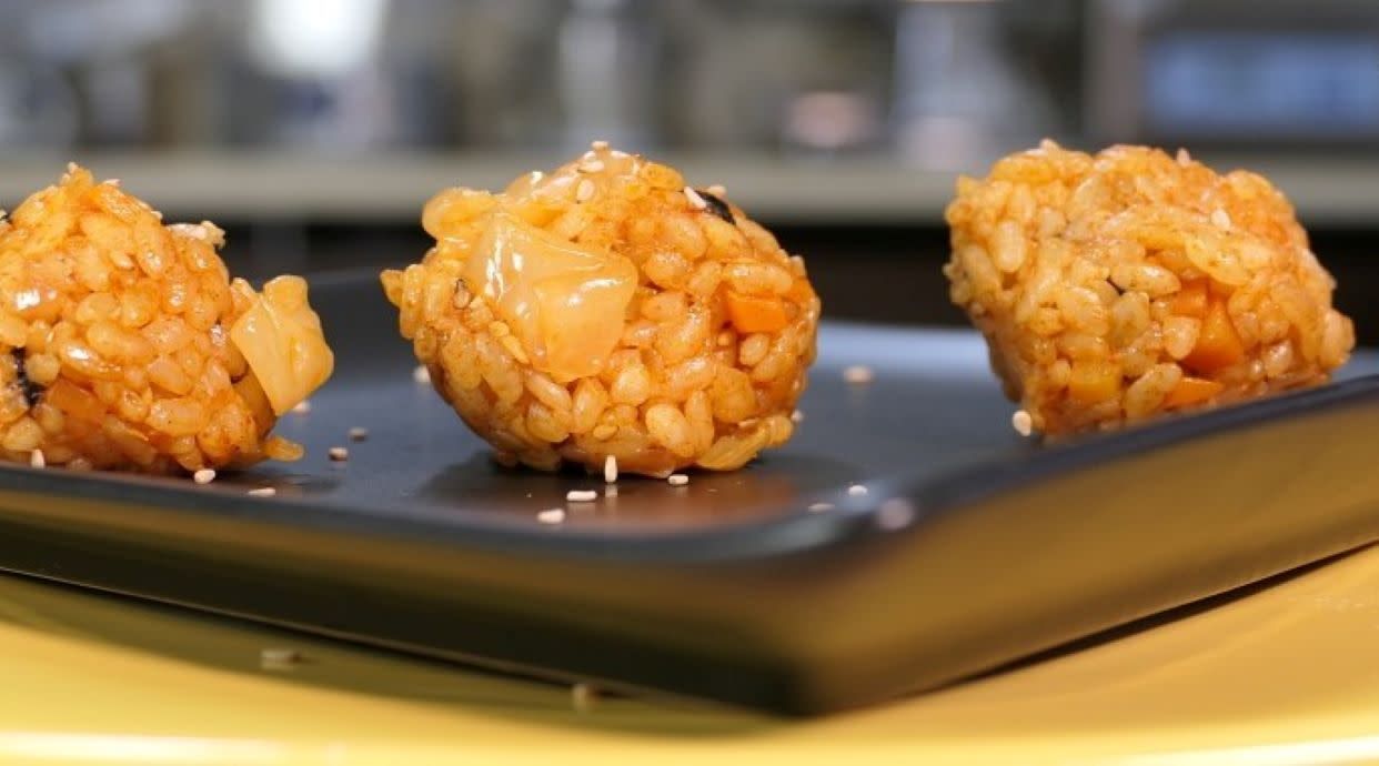 Върху бял ориз и Лютиво кисела супа (Лук, чушки, бамбук, печурки, моркови, черни гъби)
