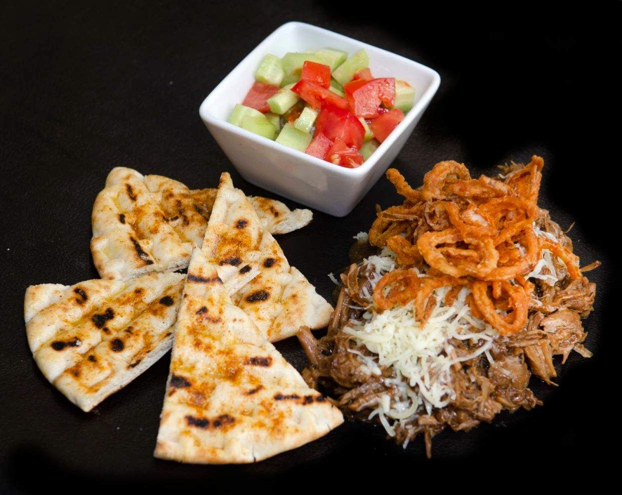 Крехко свинско месо, кашкавал и чипс от лук, поднесени с гръцка питка и салатка от домати и краставици