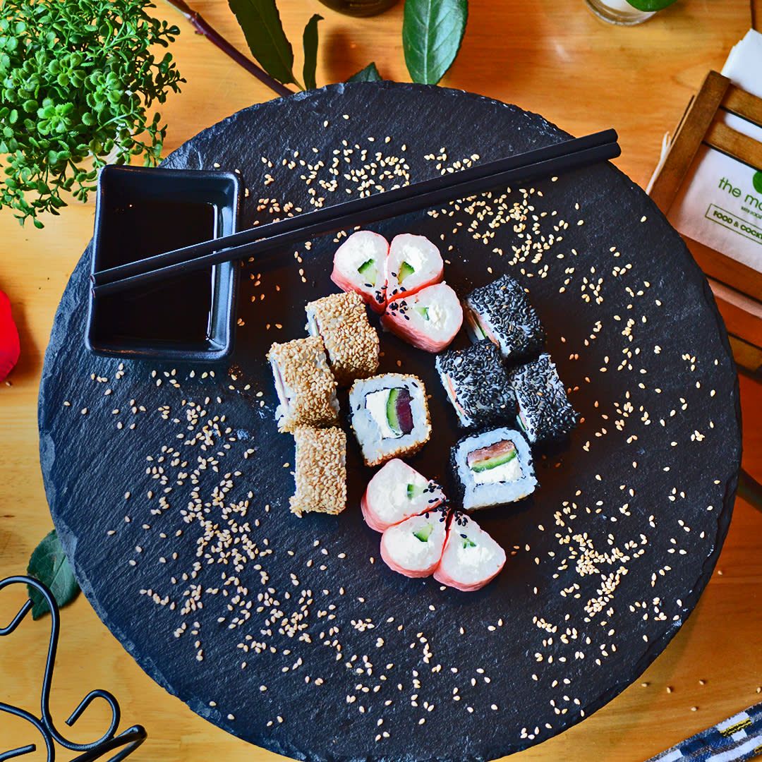 суши ориз, едамаме, манго, авокадо, краставица, тобико, гома уакаме, терияки сос японска майонеза и сусам 300гр Тамаго, манго, филаделфия, едамаме ядка, японска майонеза, терияки сос - 300г