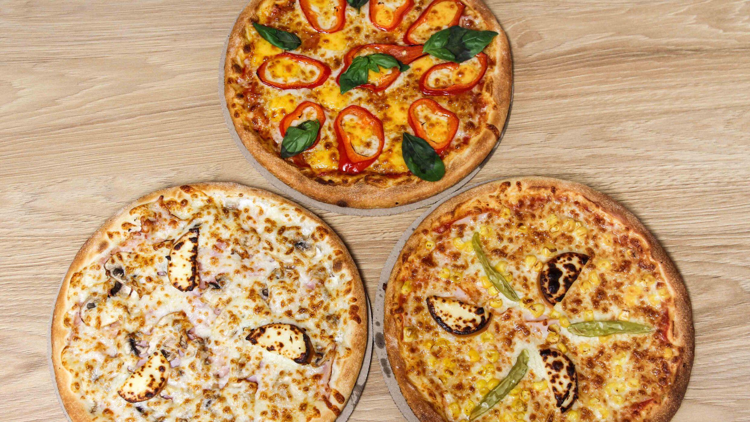 Пица сос, луканков колбас, шунка, кисели краставици, лук, маслини, царевица, моцарела