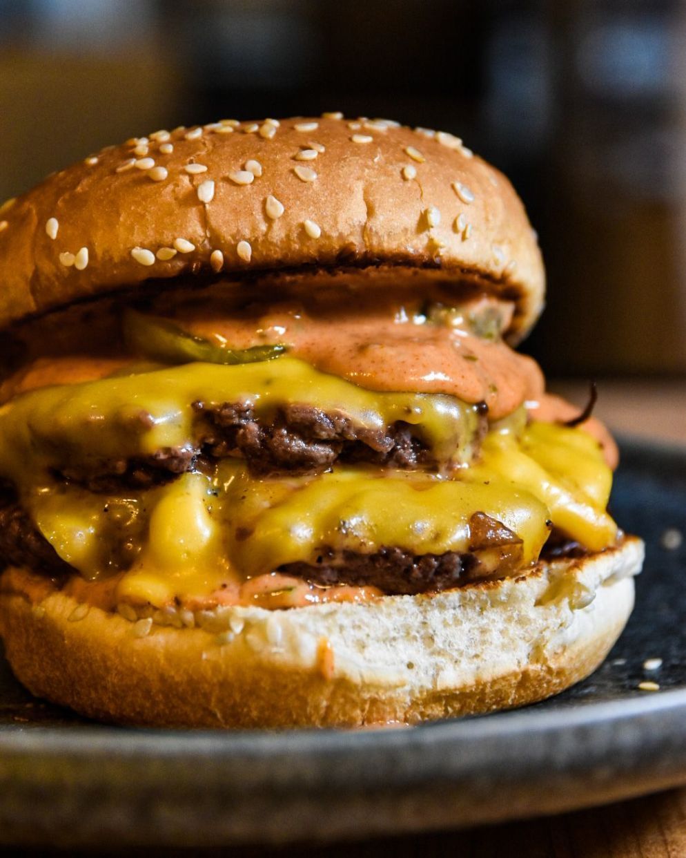 Двоен Леко пикантен Smash Adana бъргър, чедър, доматена салца, пукани пикантни чушки, пресен червен лук, магданоз, сумак, млечен сос, бургер питка - 350 г