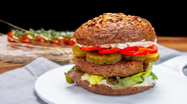 Двойно телешко кюфте (180г), пресен домат, прясна зелена салатка, пресен червен лук, кисели краставички, кашкавал, бекон и сос