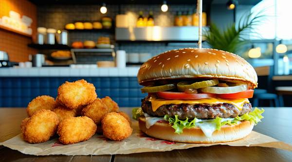 Nuggets de pollo en pan potato roll, queso cheddar americano, lechuga, salsa burga y patatas fritas.