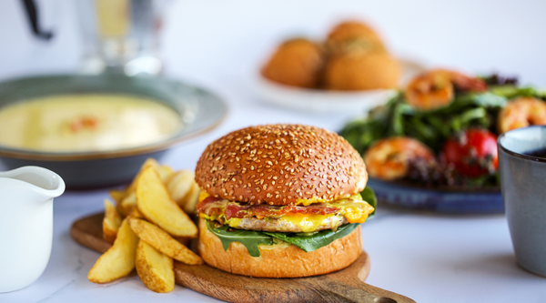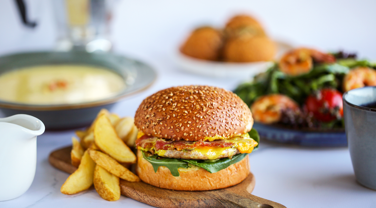 Carne, lechuga, tomate, cebolla, bacon, queso y huevo