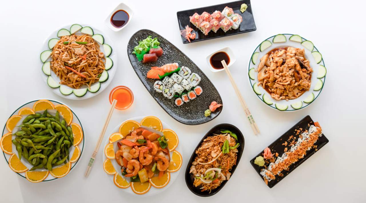 Gambas, pollo, jamón, salsa soja, verdura variada y huevo