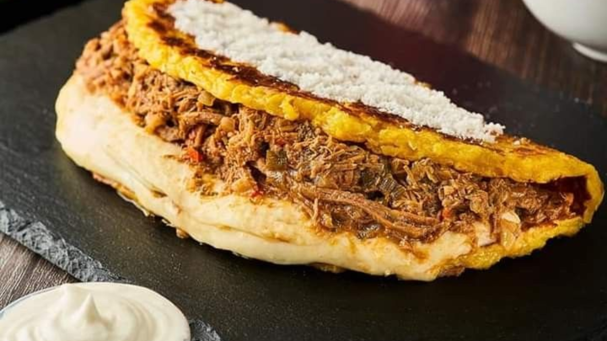 Arepas de maíz con carne desmechada y queso amarillo