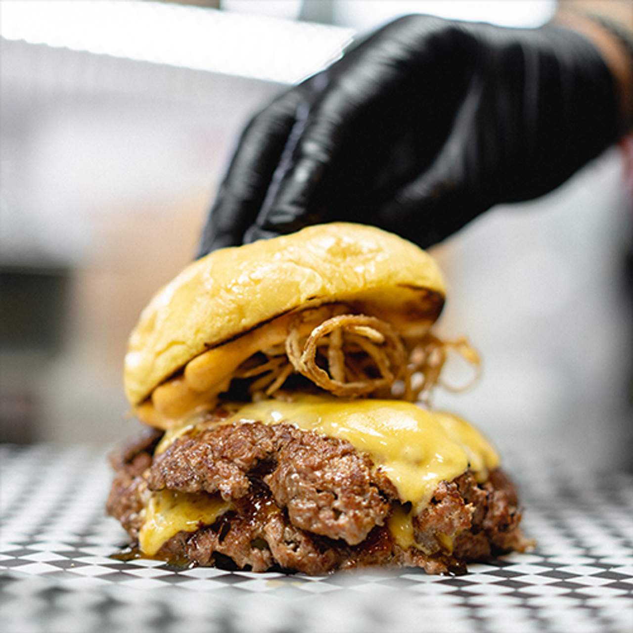 Pan brioche de molde, doble carne Oklahoma style con cebolla, salsa secreta, bacon ahumado caramelizado, cheddar picante y ahumado, lechuga y pepinillos.
