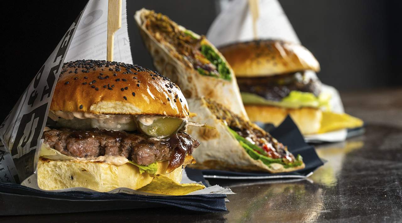 Carne de ternera, lechuga, cebolla, maíz, pepino, oliva y salsas