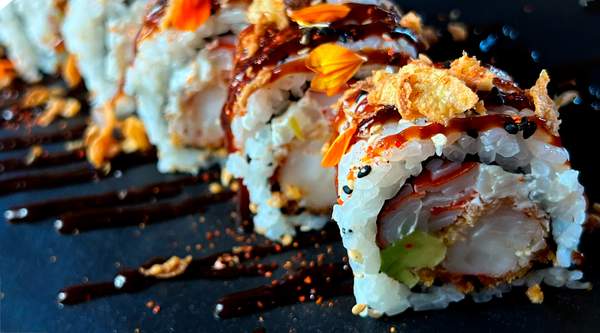 Gambón en panko, cangrejo, queso crema, pepino, cebolla crujiente y salsa hoisin.