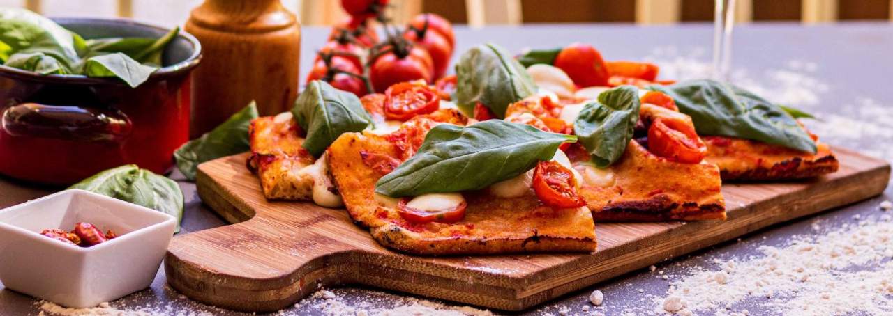 Salsa de tomate con albahaca, berenjena, parmesano y mozzarella
