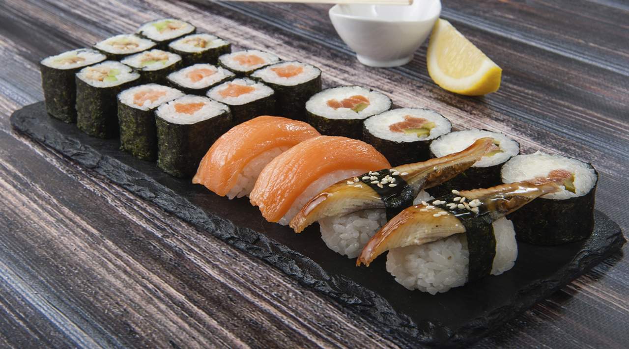Uramaki con langostino en tempura y aguacate cubierto de salmón y anguila