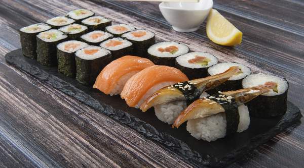 Maki de salmón (4 uds.), aguacate (4 uds.), uramaki de crunch California (4 uds.), salmón deluxe (4 uds.), nigiri de salmón (2 uds.), atún (2 uds.), sashimi de salmón (4 uds.)