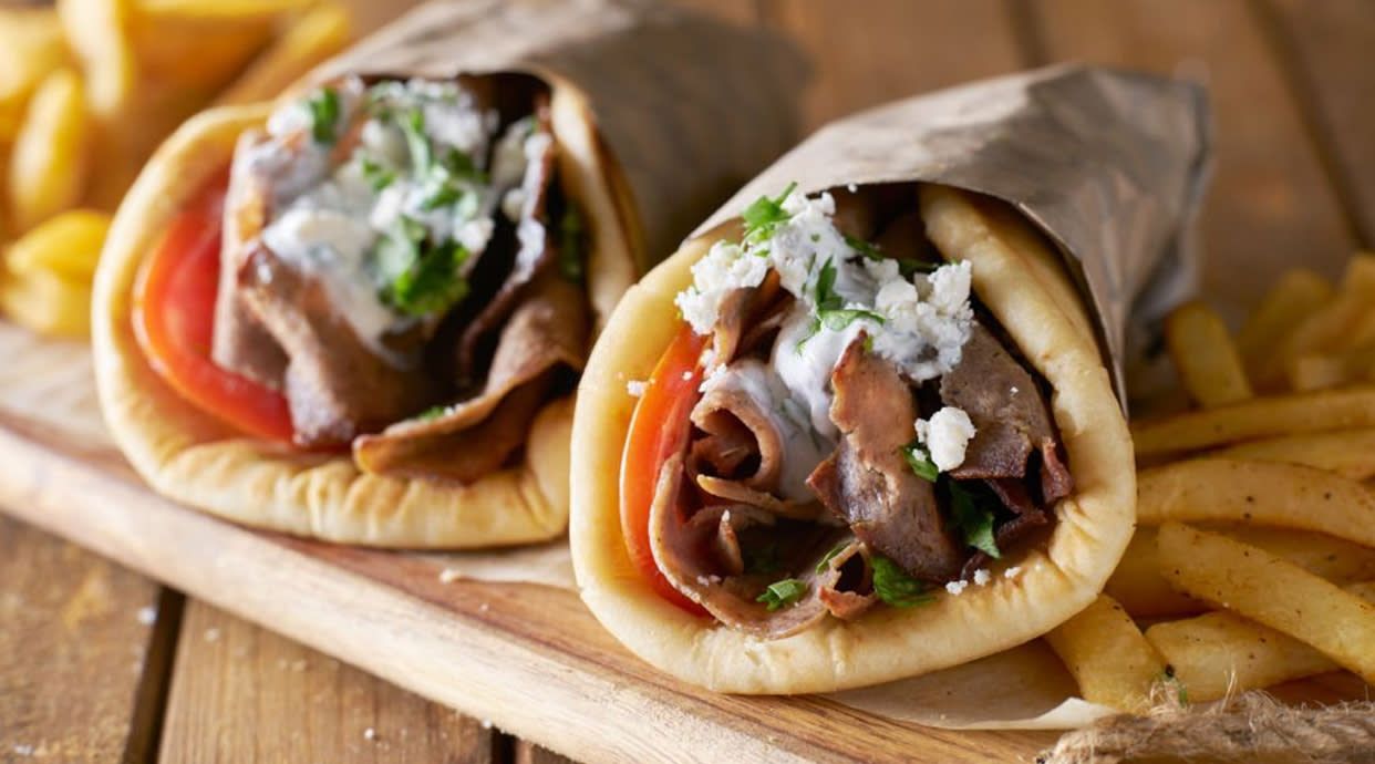 Ternera o pollo enrollado en pan de pita y salsas