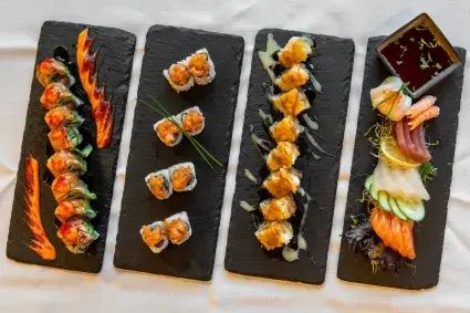 Tempura con alga, langostinos, aguacate, salsa de chile dulce