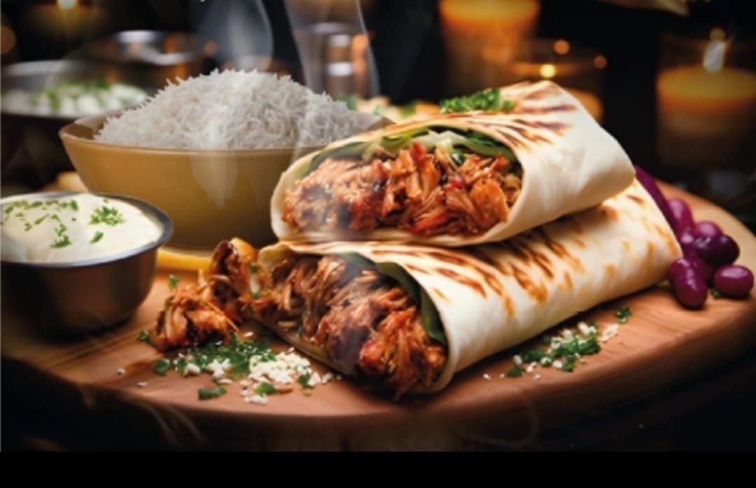 Carne de pollo con carne de ternera ensalada mixta y salsa de Granada y salsa blanca.