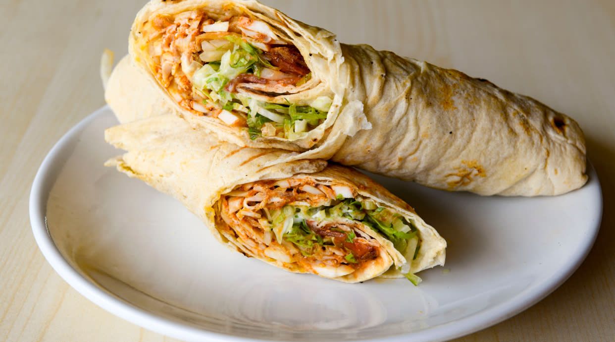 Ternera o pollo enrollado en pan de pita, ensalada y salsas