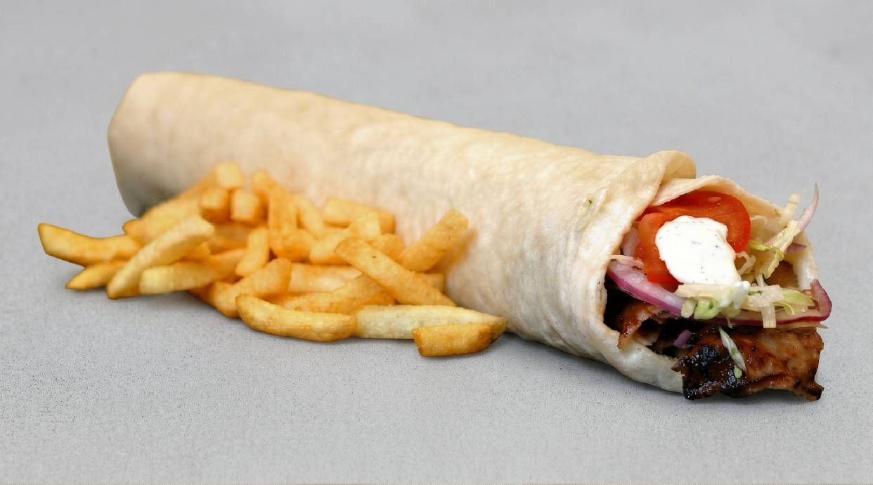 Tortilla de trigo, doble de ternera o pollo, lechuga, tomate, cebolla, salsa blanca, salsa picante, mayonesa y kétchup.