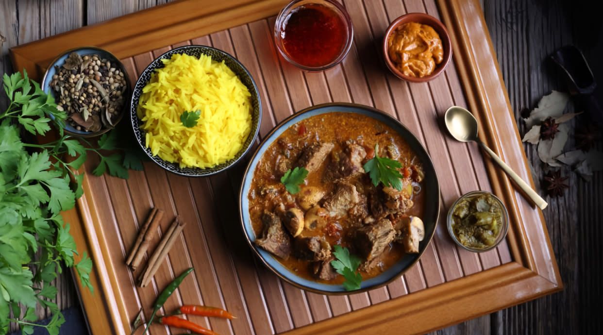 Trozos de cordero con arroz basmati y servido con salsa de curry, picante suave