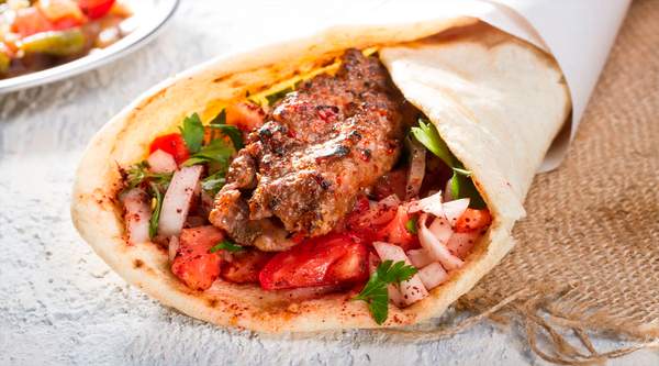 Ternera, pollo o cordero a elegir con lechuga, zanahoria, cebolla, maíz, tomate y salsa