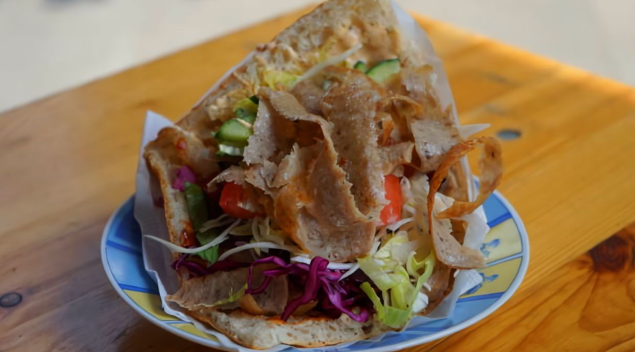 Una combinación deliciosa de pollo y ternera en pan de kebab, con vegetales frescos y salsas