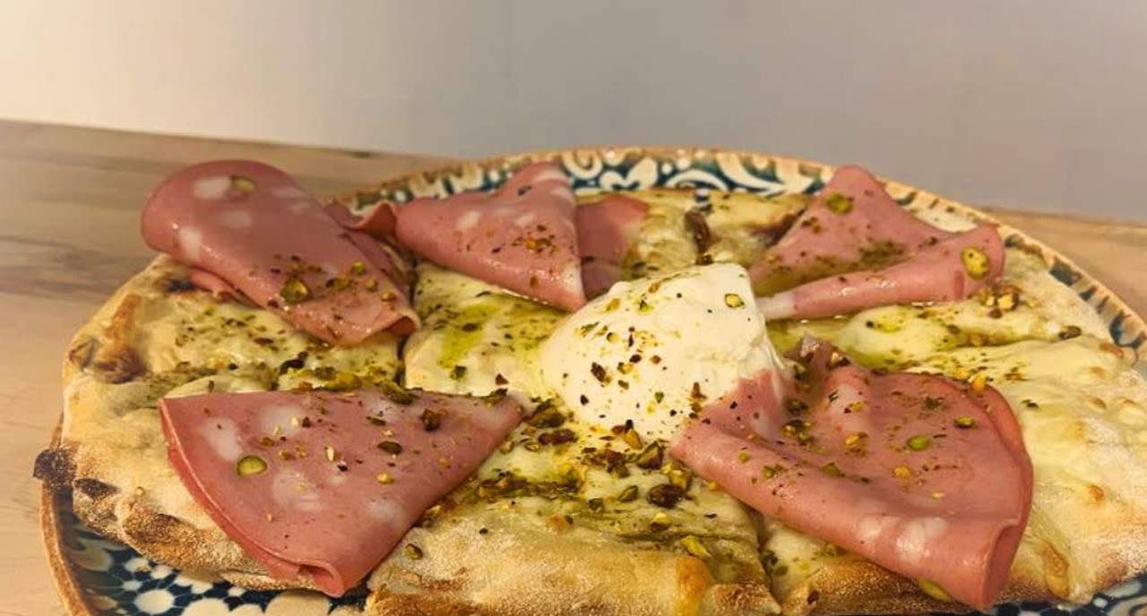 Burrata, mozzarella, mortadela y pesto de pistacho. Pizza ovalada